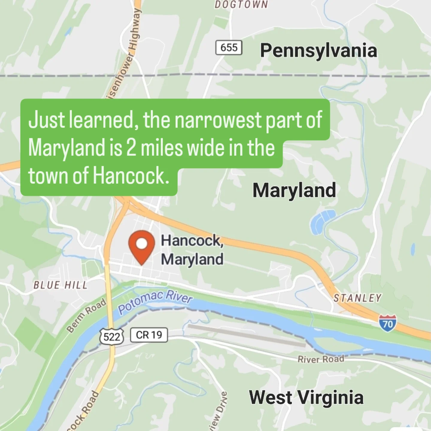 Glad you asked. While staring at maps and looking for trails to explore, I discovered the narrowest part of Maryland is about two miles wide in the town of Hancock, Washington County. Pennsylvania is on one side, West Virginia is on the other. This spring I’m going to visit so I can run through three states in one trip with the least amount of effort.